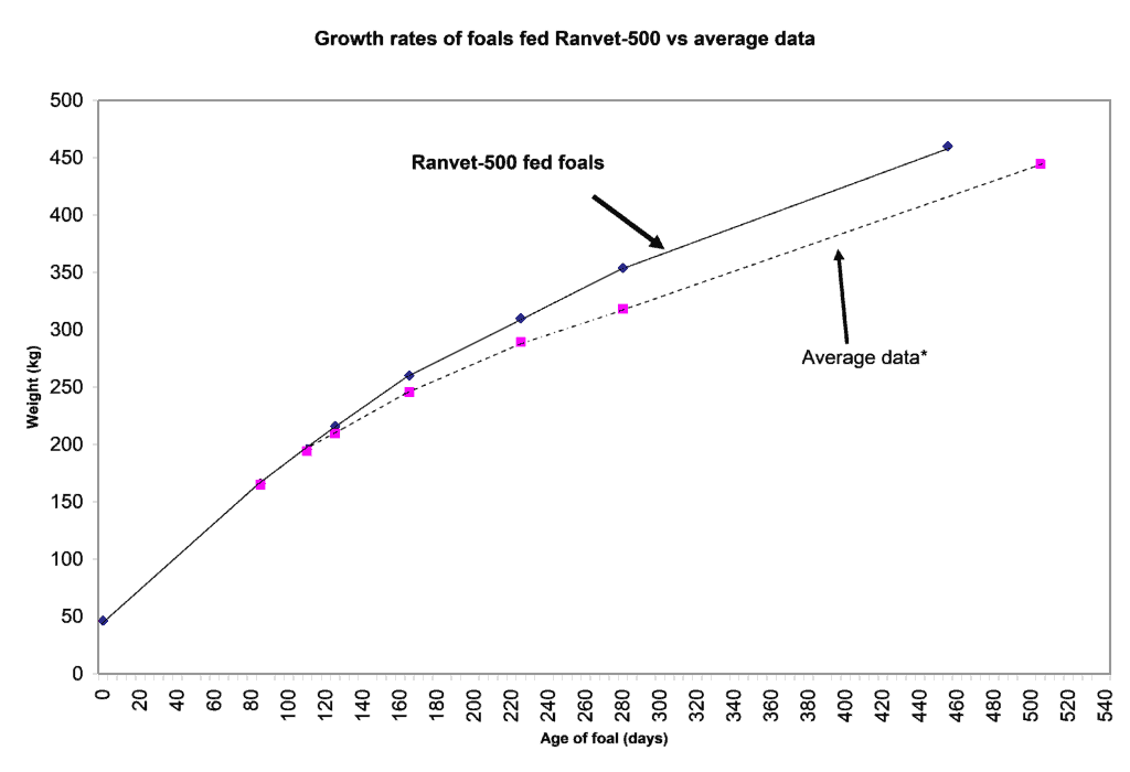 Reference Figure: Growth Rates of Foals Fed Ranvet 500 PLUS vs Average Data * Source of data: Journal of Animal Science (1995) 73, 2513-2517